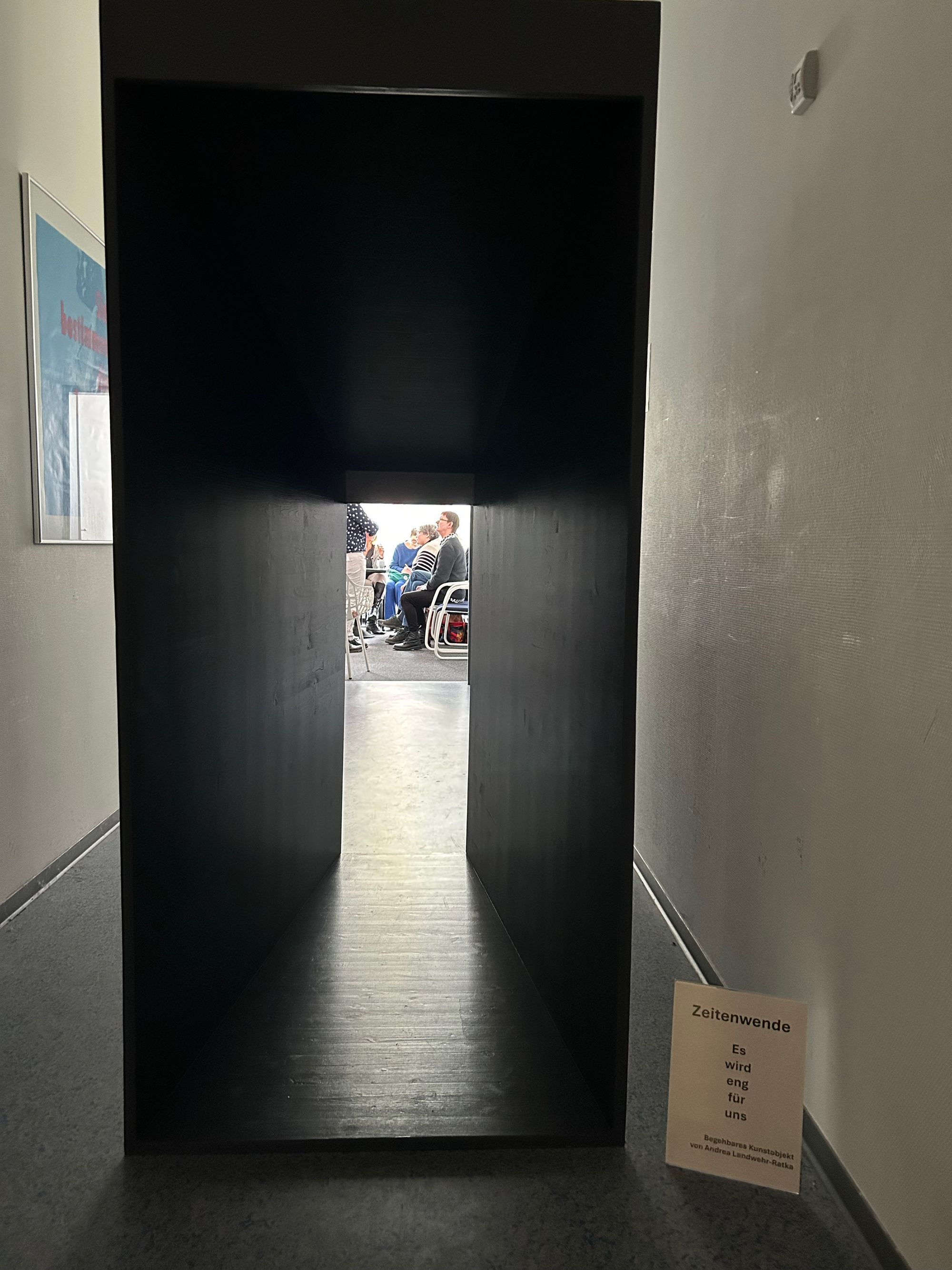„Eigentlich ist es ja nur eine Kiste, aber sie bringt so vieles genau auf den Punkt“, mit diesen Worten eröffnete die Bamberger Landtagsabgeordnete Ursula Sowa die Kunstausstellung in ihrem Büro, in deren Mittelpunk ein begehbares Kunstobjekt der Bamberger Künstlerin Andrea Landwehr-Ratka steht. Es ist eine Art Tunnel mit personenhohem Eingang, aber kleinem, beengten Ausgang. Der:die Betrachter:in wird so zum:zur Begeher:in, denn man muss schon durch das Kunstobjekt hindurch, um es zu erleben. „Es wird eng für uns“ ist sein Titel. Geschaffen wurde das Objekt für die Ausstellung „Zeitenwende „des BBK Oberfranken im Jahr 2023.