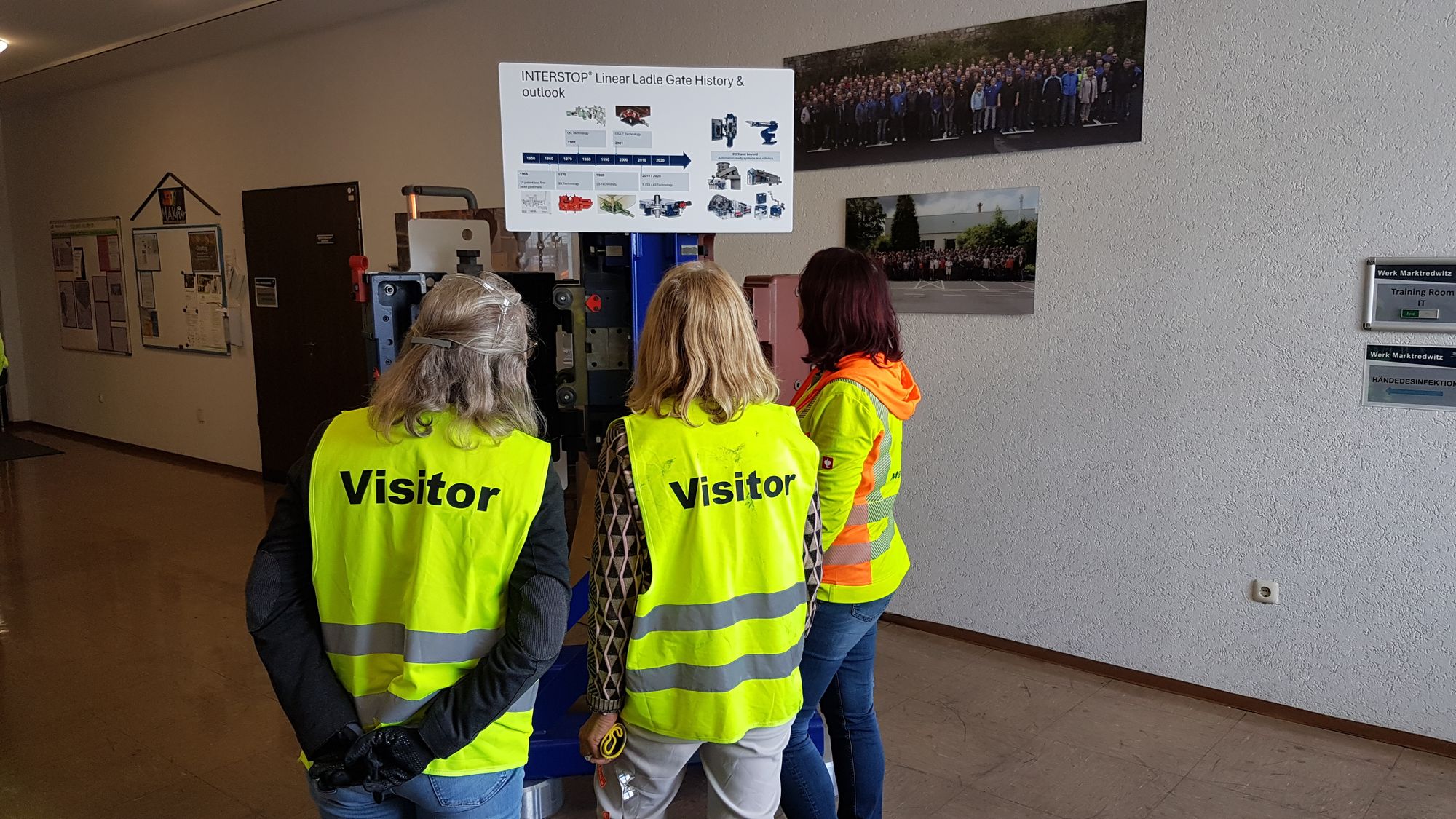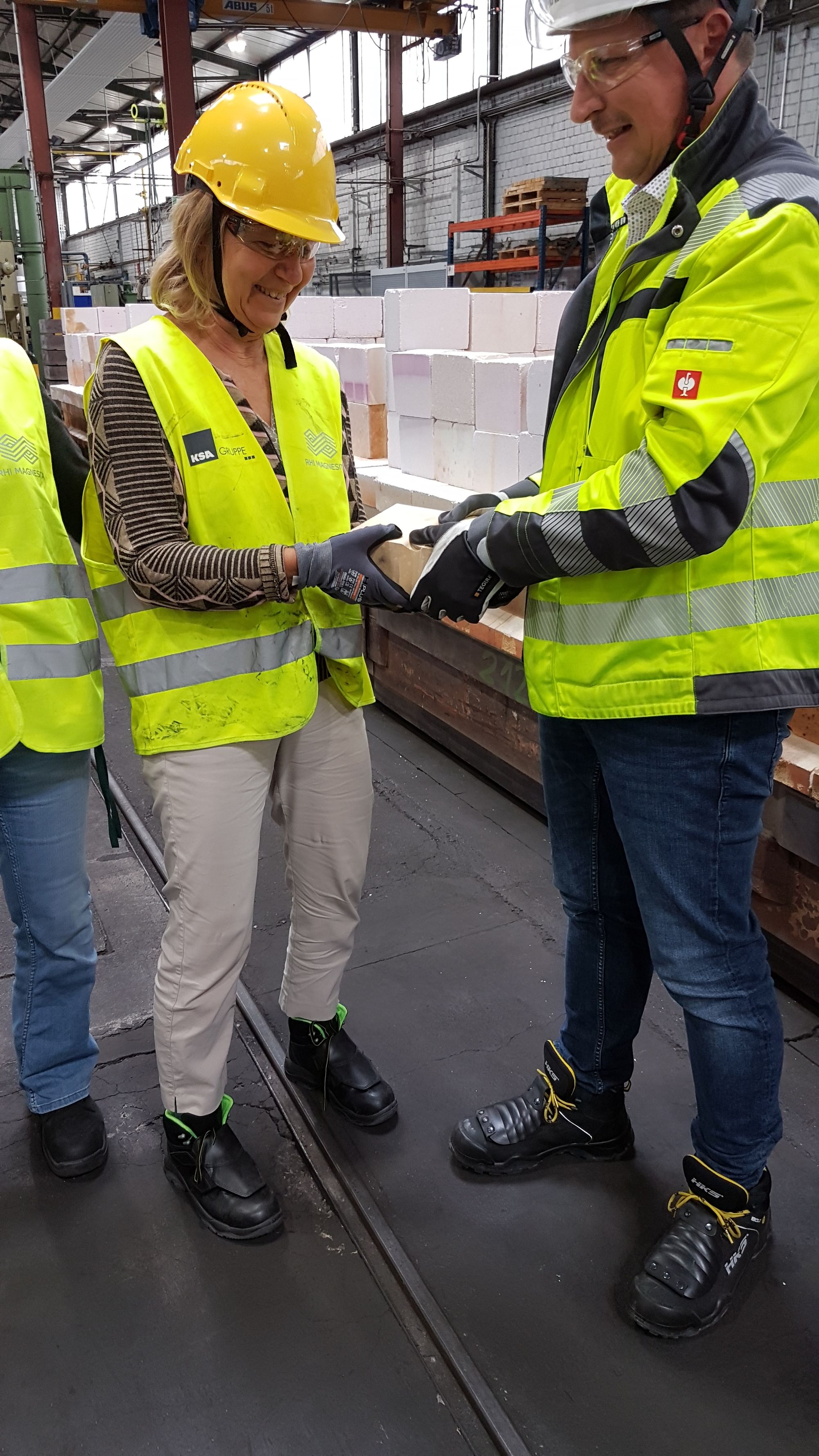 Werkleiterin Birgit Bellgardt-Dolc und Stefanie Streit vom Umwelt-Energie-Team informierten über Unternehmen, Produkte sowie Kreislaufwirtschaft, Emissionen und selbstgesetzte CO2-Ziele des Weltmarktführers. Schrittweise Dekarbonisierung habe hierbei einen wichtigen Stellenwert, jedoch gäbe es nicht viele Möglichkeiten für energieintensive Unternehmen, um klimaneutral zu werden. Da bei den für die Produktion benötigten hohen Temperaturen nur Wasserstoff als emissionsarme Alternative denkbar ist, sei es wichtig, für die Wirtschaft erschwingliche Preise und Infrastruktur sicherzustellen. Dass eine Umstellung möglich ist, hätten die Brennversuche in diesem Jahr gezeigt. Die Auswertung laufe aktuell noch. „Wir sind bereit und können jederzeit an dem umgebauten Haubenofen mit Wasserstoff produzieren“, so Bellgardt-Dolc.